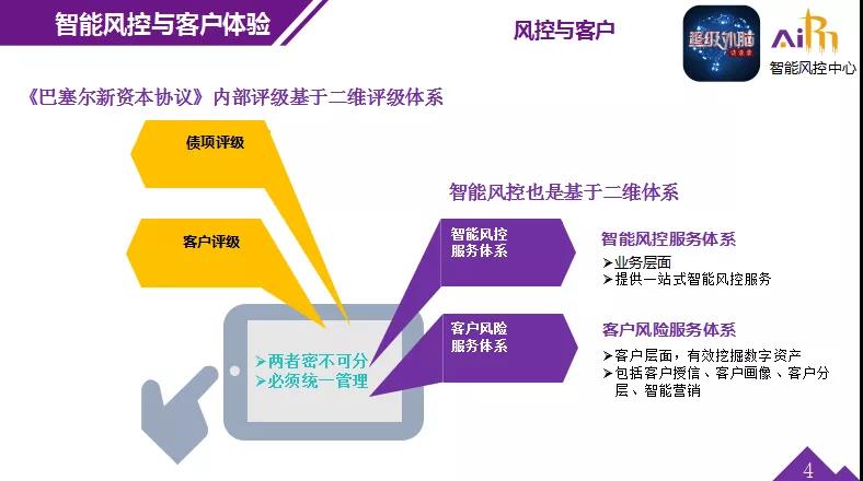 1.将《巴塞尔新资本协议》基于二维评级体系用于风控如何接触客户。这对比于传统风控手段,现在的风险管理要需要有量化的思维:万事皆量化的想法,为客户体验的发展提供了可行性。