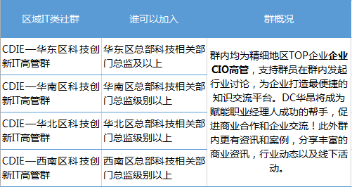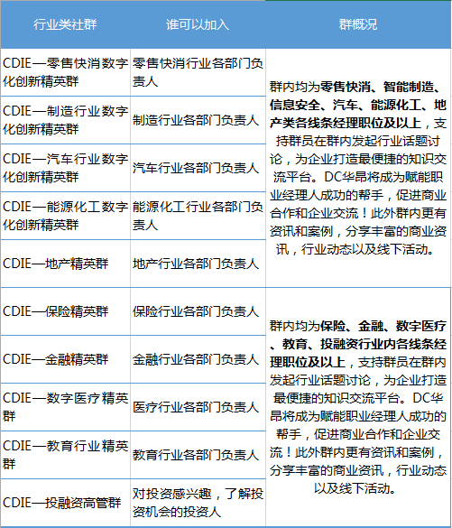 CDIE优质微信社群是由上海DC华昂搭建的资源整合与分享交流的平台。目前运营30+优质微信社群,包含高管类、行业类、直播类、话题类、功能类、区域类等不同类型,覆盖全国500强企业及中国各行业企业5000+核心高管。为了体现各社群的价值,保证社群成员高效交流,产出更多优质内容,我们要求实名制申请入群,并制定了一系列详细分类及严格的群规,绝对是您交友、学习的最佳平台。