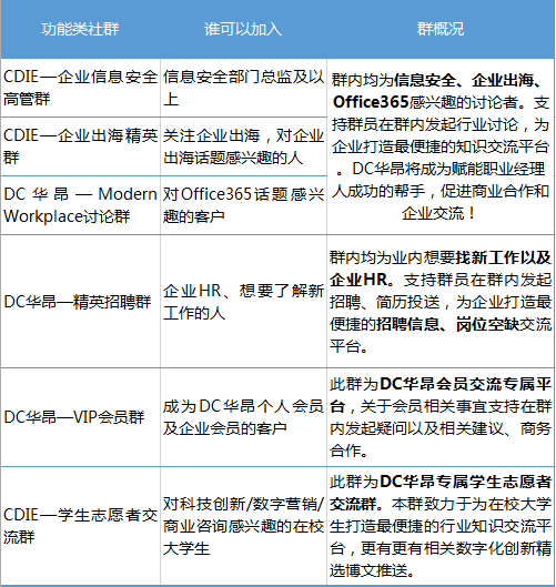 社群宗旨:致力于为企业打造最便捷的知识分享交流平台。支持群员在群内自由发起行业话题讨论、痛点深刻分析。DC华昂将成为赋能职业成功的帮手,促进商业合作和企业交流!此外群内更有资讯和案例,分享丰富的商业资讯,行业动态以及线下活动。